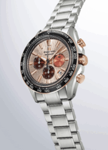 La «Evolution 9 Collection» fue la primera en dar la bienvenida al único cronógrafo mecánico de Grand Seiko: calibre 9SC5, el Tentagraph. Rindiendo homenaje a la naturaleza que rodea su lugar de origen, esta nueva creación lleva la fusión del espíritu de Grand Seiko con las sensibilidades estéticas de Japón a un nivel superior, combinando el cálido dial de tono cobre-rosado con los acentos de oro rosa del estuche, evocando un amanecer en la cima.