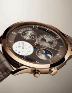 En la esfera, creada en los talleres suizos de Noirmont, las cifras diseñadas por el diseñador gráfico Philippe Apeloig destacan ligeras y marcan el ritmo del tiempo. El centro, de un tono marrón galvánico, refleja la luz desde diversos ángulos y acoge unas agujas bastón doradas que indican horas y minutos. La fecha, el mes, el segundo huso horario, los años bisiestos y las fases lunares –de nácar sobre cielo de aventurina– se presentan en cuatro contadores. La exquisitez de los acabados –arenado, acaracolado y soleillé– acentúa la profundidad y legibilidad de las indicaciones relojeras y, al mismo tiempo, subraya la finura y sobriedad de la caja de oro rosa, de 39,5 mm de diámetro.
