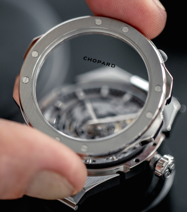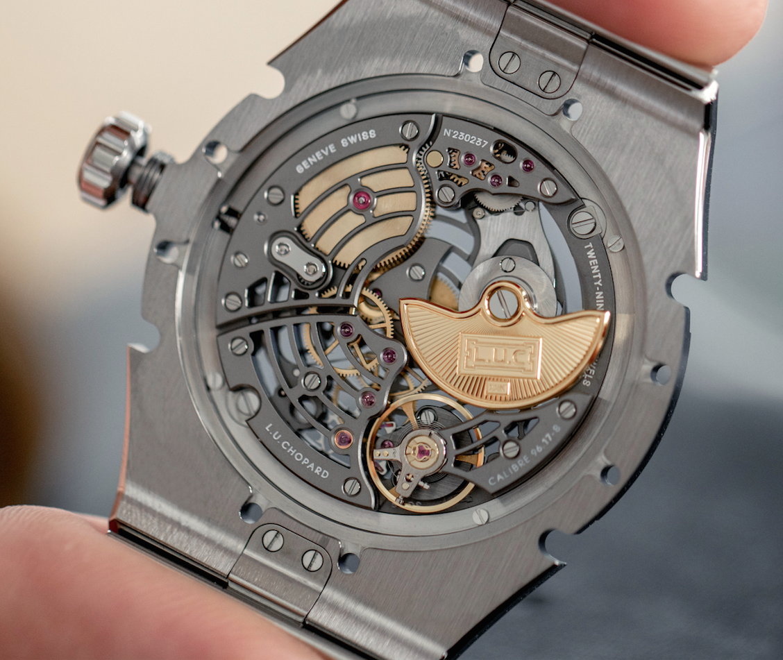 Con el fin de revelar todos los detalles del movimiento, el reloj carece de esfera, y en su ausencia se han calado la platina y los puentes, siguiendo el sentido de la abertura de la caja, creando espacios concéntricos alrededor del centro del movimiento, de tal manera que se puede admirar la marcha de los distintos componentes del calibre. Con esta iniciativa, propia de Chopard, la Manufactura ha querido apartarse de la práctica de los cincelados tradicionales. La platina y los puentes se presentan además arenados, un acabado que contrasta con las superficies pulidas de la caja y el brazalete, atrayendo la mirada hacia el movimiento. A continuación se aplicó un rodiado en negro para crear un nuevo contraste que resaltara los engranajes dorados.