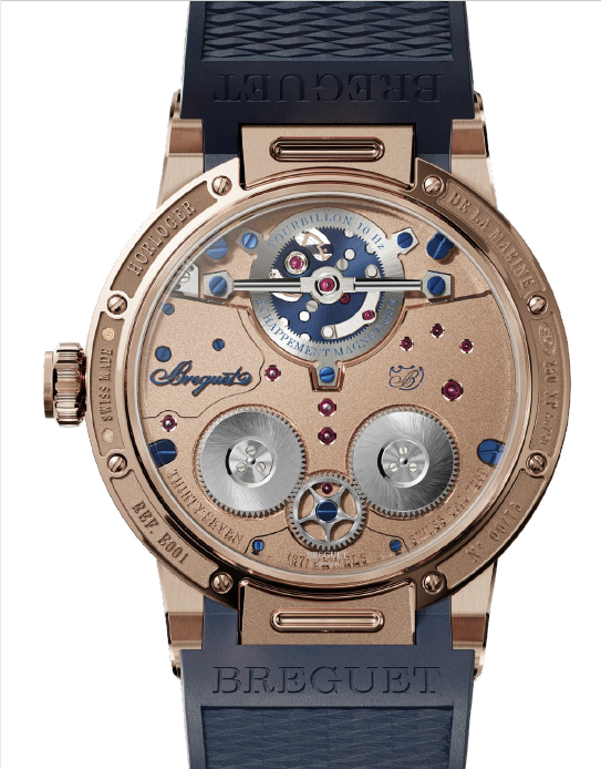 Al desacoplar estas dos funciones, Breguet ha logrado crear un tourbillon con un oscilador de 10 Hz en unas dimensiones tales que también dan rienda suelta a las opciones de diseño, por ejemplo, colocando el volante desplazado del centro de rotación de la jaula. Gracias a la alta frecuencia, la rotación de todo el tourbillon es tan suave que sus pasos son imperceptibles para el ojo.