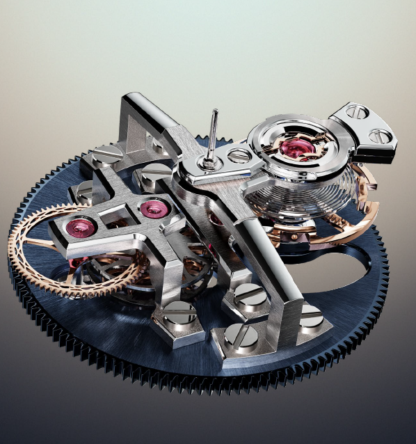 Se trata de dos ruedas de escape, cada una de ellas dotada de una pista magnética, en cuyo centro late un áncora con paletas también magnéticas. La idea se inspira en los escapes de fuerza constante. Por debajo de un determinado par de funcionamiento, el tourbillon se detiene muy rápidamente. Por encima de este umbral, el volante oscila a su máxima amplitud.