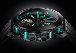 La esfera y el fondo transparente de la caja de 44 mm de diámetro, realizada en titanio con tratamiento de DLC negro y zafiro, ofrecen a los connoisseurs una completa inmersión visual en el mecanismo del reloj. Se trata de un movimiento de cuerda manual con tourbillon volante, calibre BVL 206. Una de las características ópticas más significativas de dicho calibre es que incorpora 11 puentes tratados con DLC negro y adornados con unas barras realizadas con ITR2, un compuesto único a base de partículas de nanotubo de carbono –ofrece la dureza del metal- y SLN, un material luminiscente de alta tecnología. Los puentes sujetan el movimiento y al mismo tiempo hacen la función de índices horarios.