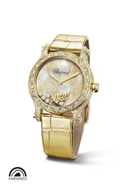 Como parte del compromiso con el oro ético, el reloj de Alta Relojería “L.U.C Full Strike” y el reloj “Happy Palm” se han fabricado exclusivamente en oro Fairmined.