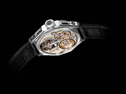 Este movimiento de carga manual contiene 15 puentes y 3 semipuentes de alpaca, encerrados por pilares de titanio pulido, rodeando los órganos mecánicos. Esta construcción es característica de los cronómetros marinos del siglo XVIII, y permite a los ojos de buey del reloj mostrar su interior.