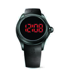Sin agujas que marquen la hora ni números o la más mínima decoración, la esfera permanece totalmente desconectada en el más absoluto negro. Un reloj sin vida que solo se conecta al presionar la corona. Es entonces cuando grandes dígitos LED, en color rojo, despiertan para iluminar la hora de este “Bubble” con caja de acero inoxidable, tratado con PVD negro, y correa de caucho vulcanizado.