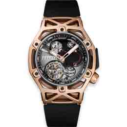 Esta pieza excepcional fue diseñada por Ferrari utilizando los mismos procesos creativos que los que utiliza para desarrollar un nuevo coche deportivo. El punto de partida de los diseñadores fue el movimiento de Hublot –el “motor” del reloj-; en torno a este componente, crearon un chasis de alto rendimiento. Su estructura reticulada –única en el mundo de la relojería- ofrece la máxima potencia con el mínimo peso. El reloj está ahora también disponible con caja King Gold de 18 quilates.