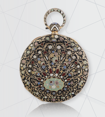 Digno de mención es también el reloj de bolsillo en oro amarillo, con horas saltantes, esmalte champlevé y esfera de plata guilloché. Las indicaciones saltantes, es decir, aquellas en las que la lectura cambia de manera instantánea, se desarrollaron para mejorar la legibilidad. Introducidas por primera vez con los segundos saltantes a mediados del siglo XVIII y después con las horas saltantes, este tipo de indicaciones obtuvo sus primeros grandes éxitos en la década de 1820 con los famosos relojes de abertura. En estos modelos, la hora se indicaba mediante cifras que aparecían en un disco saltante situado a las 12 horas, mientras que los minutos se indicaban por medio de una aguja central, como en los relojes reguladores. Vacheron Constantin destacó con una primera creación de este tipo a principios del siglo XIX. Pronto le siguieron otros modelos, como este reloj con una carrura adornada con un esmalte champlevé con motivos vegetales que incorpora la apertura de la hora saltante. La esfera plateada con guilloché tiene un minutero central y un segundero pequeño a las 6 hora