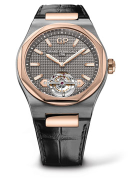 El “Laureato Tourbillon” dispone de caja de 45 mm, de titanio salpicado de oro. Funciona con el calibre GP09510, fabricado en su totalidad por Girard-Perregaux. Emula la estructura y el diseño emblemáticos de los tourbillones de la Maison, que ha hecho del puente de oro en forma de flecha un sello inconfundible.