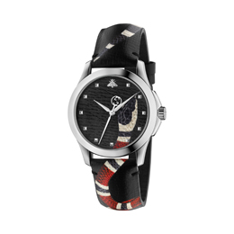 Sin embargo, las novedades de Gucci no se reducen a la línea “Signature”: la marca nos sorprende con otras originales propuestas. Por una parte, destaca “G-Timeless Snake”, una espectacular versión de “G-Timeless”, que incorpora una esfera de piel gris, el mismo material utilizado para la correa, con una serpiente estampada. La figura de la serpiente se inicia en la esfera y se prolonga hasta el final de la correa. El reloj dispone de caja de acero.