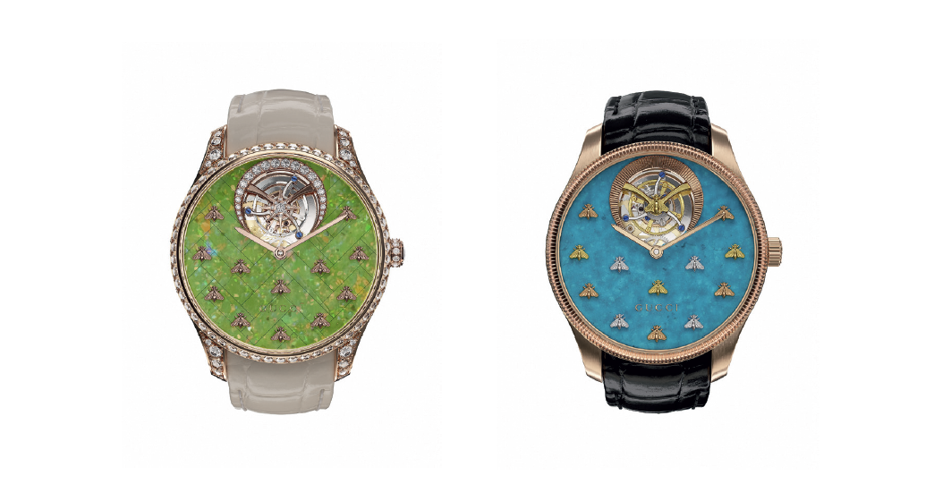 La colección G-Timeless Dancing Bees celebra el motivo de abeja, en un homenaje a la vida y la naturaleza que conquista el espacio. 12 abejas doradas bailan en la esfera, aleteando y centelleando hipnóticamente con el menor movimiento de la muñeca. Para 2023, dos excepcionales esferas de piedra rinden tributo a la Madre Tierra y a su singular belleza como único planeta que alberga vida. La primera presenta una intensa esfera de turquesa que de inmediato evoca las aguas verdes y azules de los océanos vistos desde el espacio, como en la serie de famosas fotografías tomadas durante los viajes a la Luna; la segunda captura los campos más exuberantes y verdes gracias a la vibrante esfera de ópalo verde pistacho que luce destacada por el exquisito savoir-faire de Gucci en el arte del tallado de la piedra. Aquí, las delicadas piedras primero se pulen hasta dejarlas con un grosor de tan solo 0,45 mm para, a continuación, cortarlas en pequeños rectángulos que se colocan cuidadosamente en una placa de nácar de 0,15 mm de espesor. La artesanía está al nivel de la precisión y sofisticación extremas del tourbillon que acompaña el modelo, que, salpicado de estrellas, descansa dentro de una luna creciente engastada de diamantes a las 12 h.