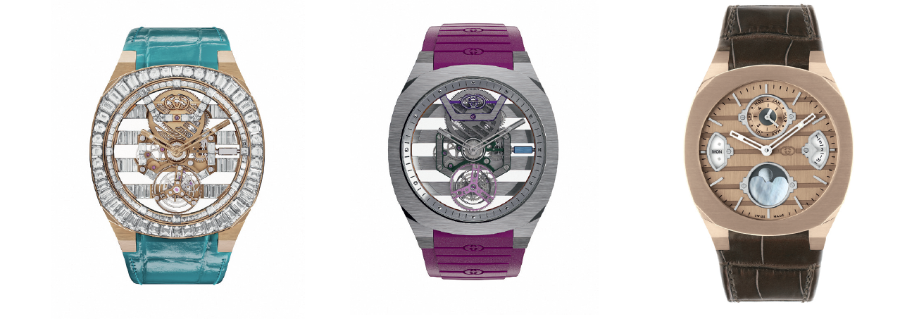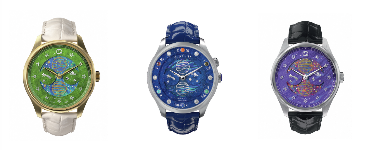 Tomando su inspiración de la era dorada de los viajes espaciales y la pasión por el descubrimiento, la Alta Relojería Gucci dirige su mirada al universo y presenta unas piezas excepcionales que marcan el tiempo con la inconfundible impronta de Gucci. Las novedades, repartidas en cinco emblemáticas colecciones, incorporan tourbillones, movimientos con fase lunar y un nuevo calendario perpetuo. Expresión del precioso legado de Gucci, hacen gala de un savoir-faire muy contemporáneo, donde la experiencia en Alta Relojería y la excelencia se fusionan con códigos icónicos de la Casa, un enfoque artístico de vanguardia y las piedras más excepcionales.