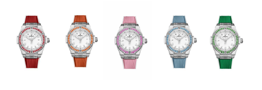 La azotea transformada por la manufactura nos recuerda a las cinco nuevas referencias del Big Bang One Click Joyful 33 mm, que adoptan los llamativos colores y piedras preciosas utilizados en algunos de los primeros modelos Big Bang de la primera década del siglo. Centelleante, trepidante y absolutamente femenino, el Big Bang One Click Joyful se convierte en el primer modelo de la colección principal del Big Bang One Click en incorporar gemas de colores y correas de caucho a juego. Cinco colores, cinco piedras preciosas, cinco estados de ánimo.
