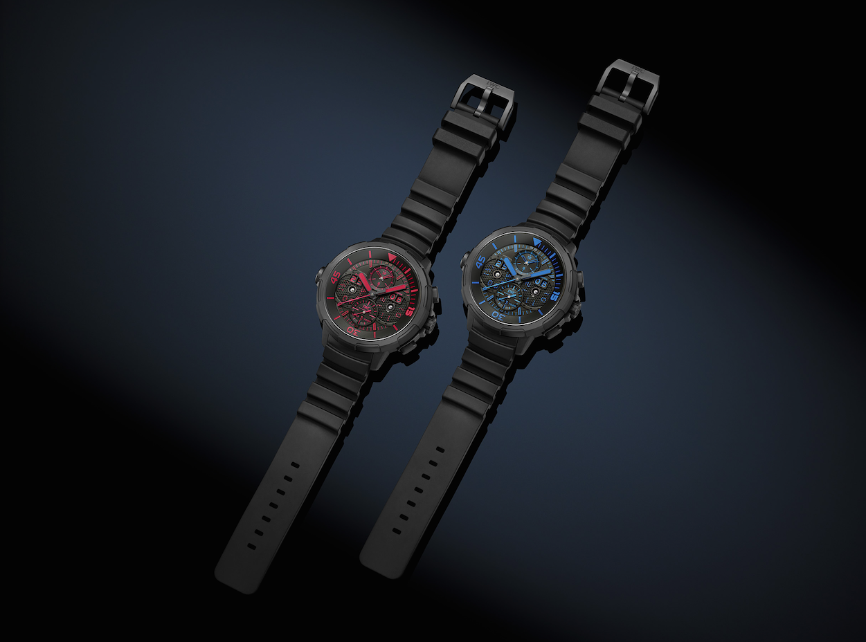 Este reloj de buceo se presenta en dos versiones, cada una limitada a 25 piezas, y presenta imponentes cajas de Ceratanium® de 49 milímetros, esferas negras y correas de caucho negras. Uno de ellos tiene Super-LumiNova® roja en la esfera, las agujas y el bisel giratorio interior, y el otro, azul. Las características técnicas incluyen un calendario perpetuo con indicación digital de la fecha y el mes, así como una función de cronógrafo. A través del fondo de cristal de zafiro se puede ver el calibre 89802 de la manufactura IWC con un componente ennegrecido.
