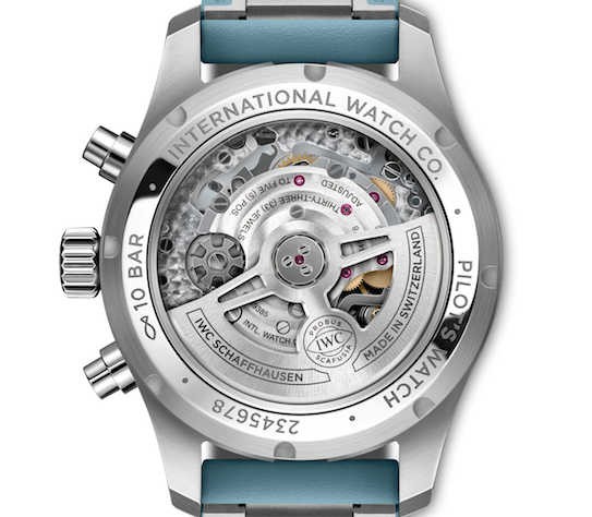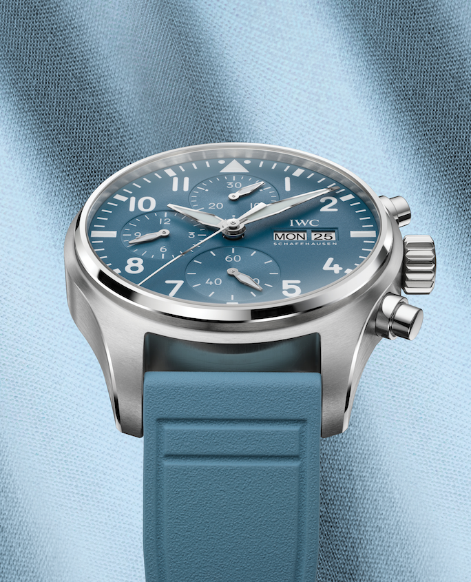Por otra parte, con el Reloj de Aviador Cronógrafo 41 (ref. IW388117), es la primera vez que IWC Schaffhausen introduce un color Pantone® en un reloj de acero inoxidable. El cronógrafo incluye una caja de acero inoxidable de 41 milímetros, combinado con una esfera azul y una correa de caucho de color TOP GUN Miramar. Las agujas chapadas en rodio, rellenas con Super-LumiNova®, mejoran la legibilidad.