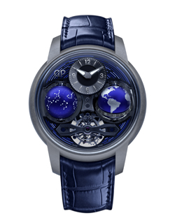 También enfocado al tema del cosmos y el universos está el reloj “Bridges Planetarium Tri-Axial Tourbillon”, una auténtica proeza de ingeniería y artesanía, pues incorpora cuatro complicaciones poco convencionales: un globo terráqueo de titanio pintado a mano que rota cada 24 horas, mostrando de forma intuitiva los husos horarios de todo el mundo; un tourbillon de 3 ejes que desafía la gravedad con su giro 3D a alta velocidad; un indicador de fases lunares, y un marcador de horas.