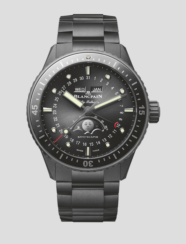 Blancpain ha desvelado su nuevo Bathyscaphe Quantième Complet Phases de lune, que se presenta con un brazalete de cerámica negra patentado de elaboración compleja y una caja del mismo material. Con un estilo seguro de sí mismo, deportivo y elegante a la vez, este modelo luce una esfera de acabado soleado en vibrantes tonalidades de azul. Disponible con una amplia gama de brazaletes, desde cerámica hasta NATO y tela de vela, el nuevo Bathyscaphe Quantième Complet Phases de Lune aporta fuerza, color y dinamismo a la línea Bathyscaphe.