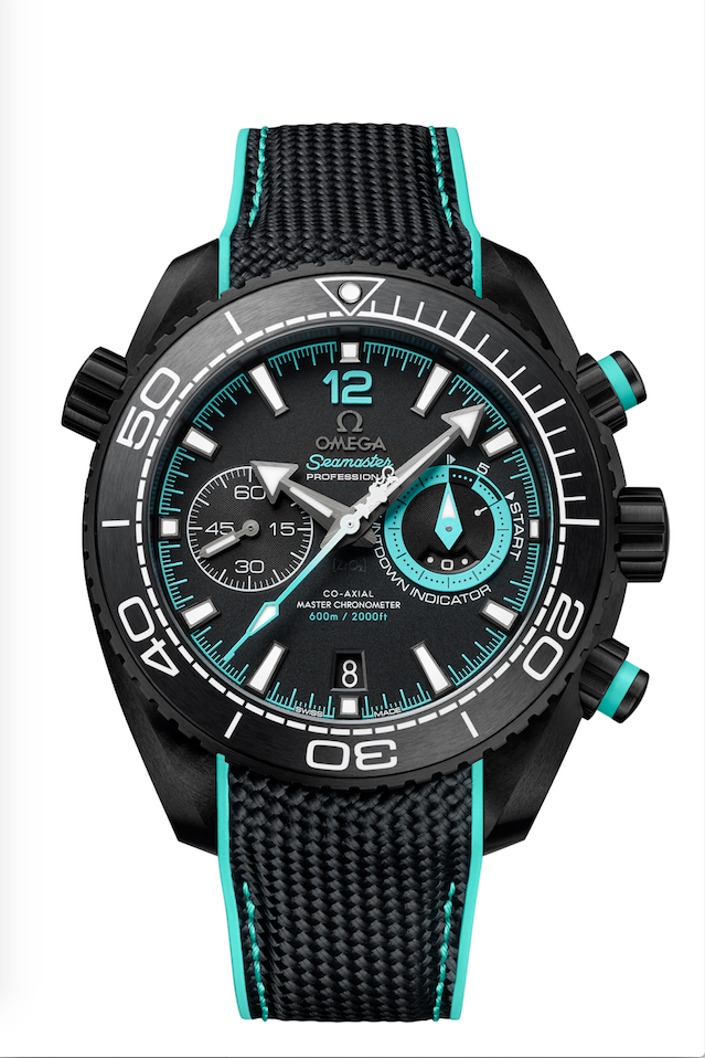 El "Seamaster Planet Ocean" de 45,5 mm combina el negro más profundo con el turquesa del logotipo del Emirates Team New Zealand. Complementa la caja de cerámica negra un bisel unidireccional de cerámica negra cepillada, con escala de inmersión de esmalte blanco y un punto enmarcado en un triángulo situado a las 12 h, que incluye Super-LumiNova blanco, para emitir un resplandor verde en la oscuridad.