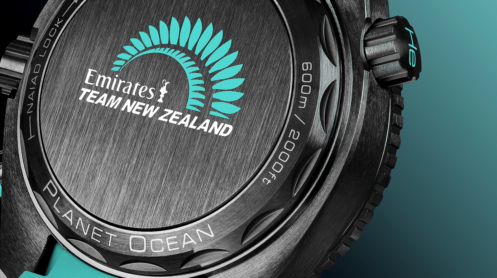 Como homenaje a la tripulación neozelandesa, el fondo de la caja Naiad Lock luce un logotipo del Emirates Team New Zealand con helecho turquesa y letras blancas. El movimiento del reloj es el Omega Master Chronometer calibre 9900.