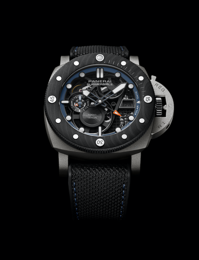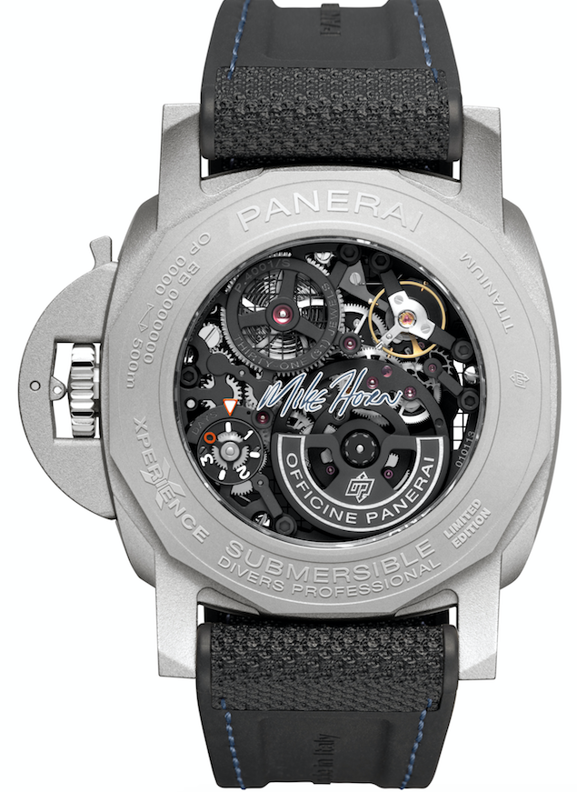 En el corazón del PAM01670 se encuentra el calibre automático P.4001/S, una interpretación de alta tecnología de un movimiento esqueletizado, que muestra el intrincado funcionamiento interno del reloj elaborado con gran destreza. Cada componente del calibre es el resultado de la experiencia técnica en relojería de Panerai y de su audaz diseño, que da lugar a una pieza que es tan visualmente impresionante como mecánicamente destacada. Tiene un diámetro de 13 ¾ líneas (31 mm), tiene 341 componentes, late a una frecuencia de 4 Hz (28,800 alternancias/hora) y cuenta con una impresionante reserva de marcha de 3 días, cuyo indicador está estratégicamente colocado en el reverso y garantiza una precisión y fiabilidad excepcionales, incluso en las aventuras más exigentes. El micro-rotor bidireccional descentrado está fabricado principalmente de tungsteno, un material denso y pesado que agrupa eficientemente los dos barriletes. El indicador de reserva de marcha, estratégicamente situado junto al micro-rotor en el reverso del movimiento, es visible a través del fondo de zafiro y luce con orgullo la firma de Horn en azul. El reloj también cuenta con una subesfera con segundero a las 9 en punto, que se pone a cero al sacar la corona y así permitir ajustar la hora de manera precisa. La complicación GMT se indica con una segunda aguja de color naranja (en referencia a los colores de la bandera de Bután) y un pequeño indicador AM/PM a las 9 en punto. Esta función es ideal para aventureros y viajeros como Mike Horn, puesto que les permite seguir fácilmente una segunda zona horaria. Gracias a su resistencia al agua de hasta 50 bar (500 metros aproximadamente), este reloj está diseñado para resistir los entornos más desafiantes en un 67% más en comparación con modelos anteriores de la línea Submersible. El reloj se ha expuesto a una presión un 25% superior al valor garantizado de resistencia al agua para garantizar que cumpla con los estrictos estándares de Panerai.