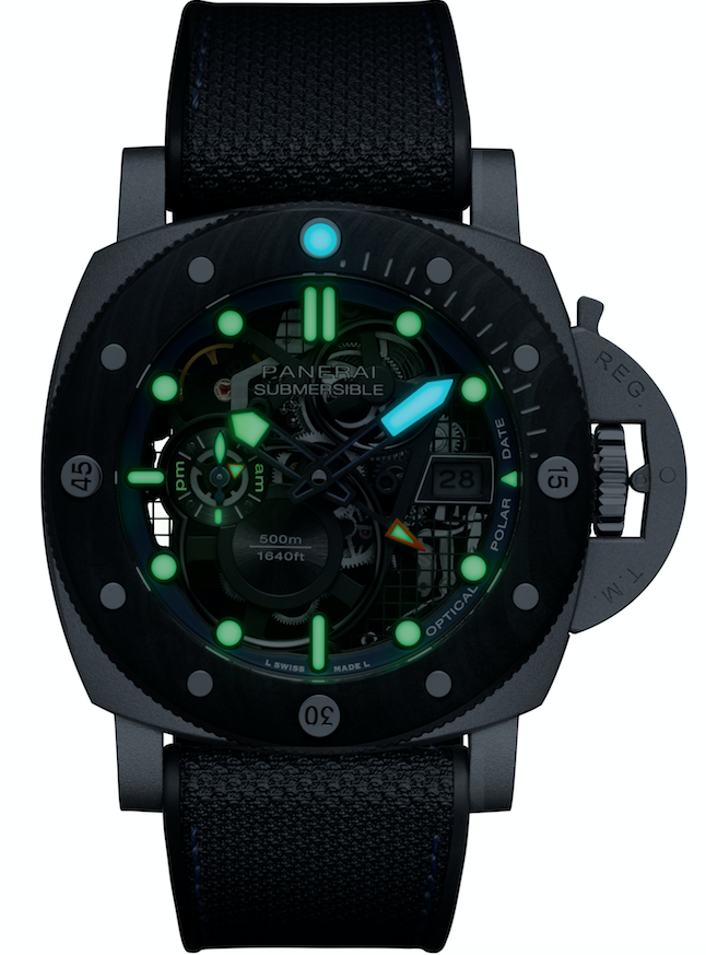 Precisión, resistencia y fiabilidad son cualidades que rodean el PAM01670. Su envergadura combina materiales de vanguardia, tecnología innovadora y la excepcional tecnicidad suiza. La caja de 47 mm está fabricada en Titanio Grado 5 bajo el proceso de sinterización láser directa de metal (DMLS), un proceso de fabricación aditiva que optimiza el peso sin comprometer su resistencia. Este material de alta tecnología es un 40% más ligero y un 60% más duro que el acero, lo que lo convierte en un compañero ideal para las hazañas extraordinarias de Horn. El reloj cuenta con un bisel rotatorio unidireccional fabricado en Carbotech™, un material compuesto ligero y resistente a la corrosión que es un 80% más ligero que el acero y un 64% más ligero que el titanio. Cada bisel de Carbotech™ tiene un patrón distintivo, lo que garantiza que no haya dos relojes exactamente iguales. El bisel solo rota en sentido antihorario, lo que permite calcular el tiempo de inmersión, una característica crucial para un instrumento de buceo. El PAM01670 presenta una esfera esqueletizada que permite entrever la construcción mecánica del reloj, donde el recubrimiento Super-LumiNova® X1 en los índices y las agujas magnifica la espectacularidad del diseño en la oscuridad y sirve como un guiño estético a la profunda conexión de Panerai con el campo de la luminiscencia. El reloj gana en sofisticación con una innovadora pantalla de fecha polarizada patentada, una exclusiva de Panerai, que permite ver la indicación de la fecha solo a través de la apertura a las 3 en punto, sin obstruir el mecanismo de su movimiento esqueletizado, sinónimo del compromiso de la Maison por superar su diseño funcional. Los números grabados con láser en un disco de cristal transparente solo se ven al pasar a por la apertura polarizada de la fecha a las 3 en punto.