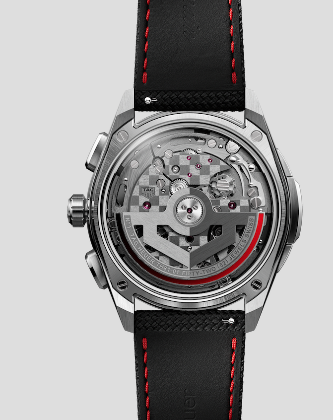 Fabricado en titanio grado 5 y compuesto por más de 350 componentes, el Calibre TH81-01 está completamente acabado a mano, y en su elaboración se han utilizado más de 10 técnicas diferentes, como pulido negro para los tornillos o biselado manual para los distintos puentes. Dichos puentes ostentan un acabado característico de TAG Heuer, el patrón de bandera ajedrezada, grabado a mano cuadro a cuadro y que distingue a los calibres más destacados de la Maison.