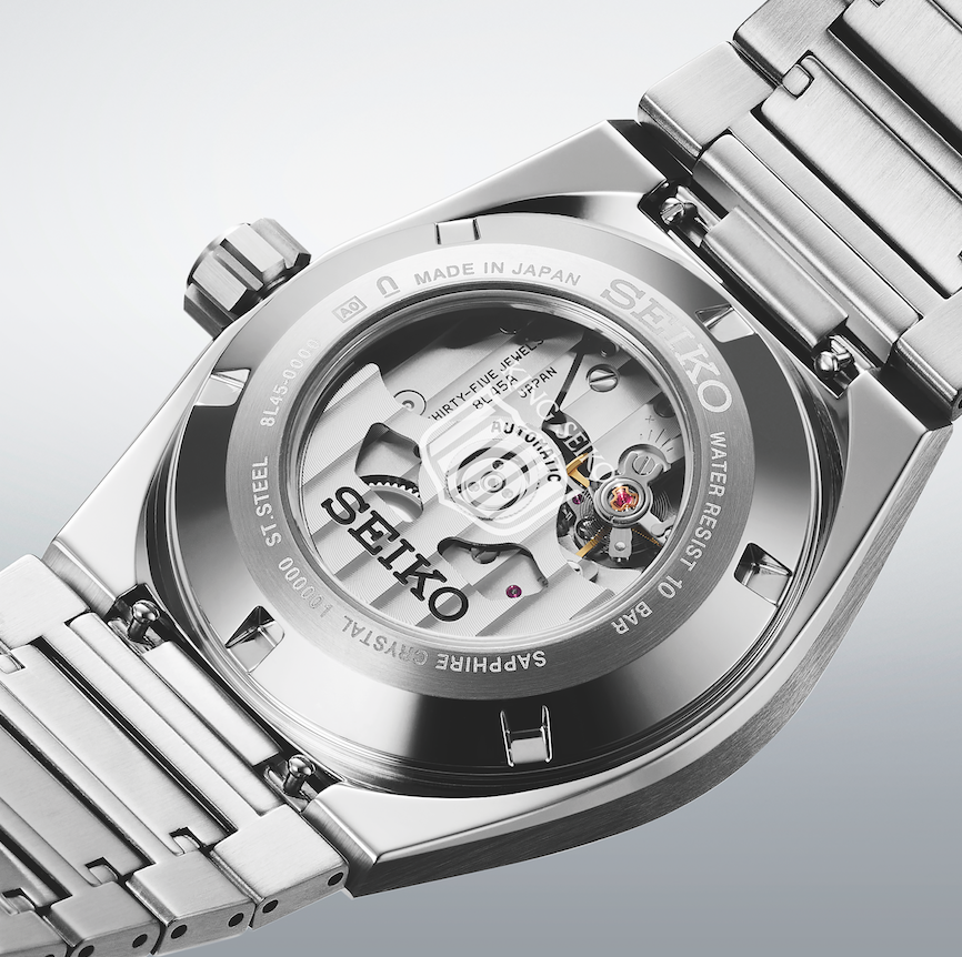 Por primera vez desde que fue relanzada la colección en el año 2022, un reloj “King Seiko” presenta fondo transparente de cristal de zafiro, a través del cual se puede apreciar el calibre 8L45, que asegura hasta 72 h de reserva de marcha. Ese movimiento incluye una espiral mejorada que garantiza una precisión de +10 a -5 segundos por día. Ha sido diseñado para que responda a las expectativas requeridas para los relojes deportivos, por lo que, entre otros aspectos destaca por su resistencia.