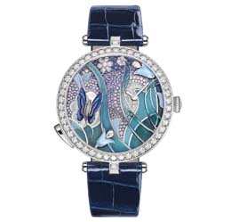 Van Cleef & Arpels presenta una nueva proeza perteneciente a la colección “Poetic Complications”. Se trata, en este caso, de un reloj de exquisita belleza que representa el aleteo de una mariposa, acompañado del paso del tiempo sobre un bucólico fondo. La mariposa -que aparece posada sobre una flor, mientras que las horas y los minutos fluyen a la derecha- adquiere vida cuando sus alas baten al azar, de dos a cinco minutos en serie, según cual sea la reserva de marcha disponible.
