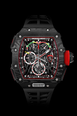 El ultraligero cronógrafo tourbillon con ratrapante RM 50-03 McLaren F1 pesa menos de 40 gramos con la nueva correa incluida, lo que lo convierte en el cronógrafo mecánico más ligero jamás fabricado. Este hito se ha logrado gracias al uso de materiales técnicos de vanguardia El diseño no solo incorpora titanio y carbono TPTTM, sino que además introduce un material completamente nuevo en el mundo de la relojería: el Graph TPTTM, más conocido como grafeno. Funciona con el calibre ultaligero RM50-03, que tan solo pesa 7 g.