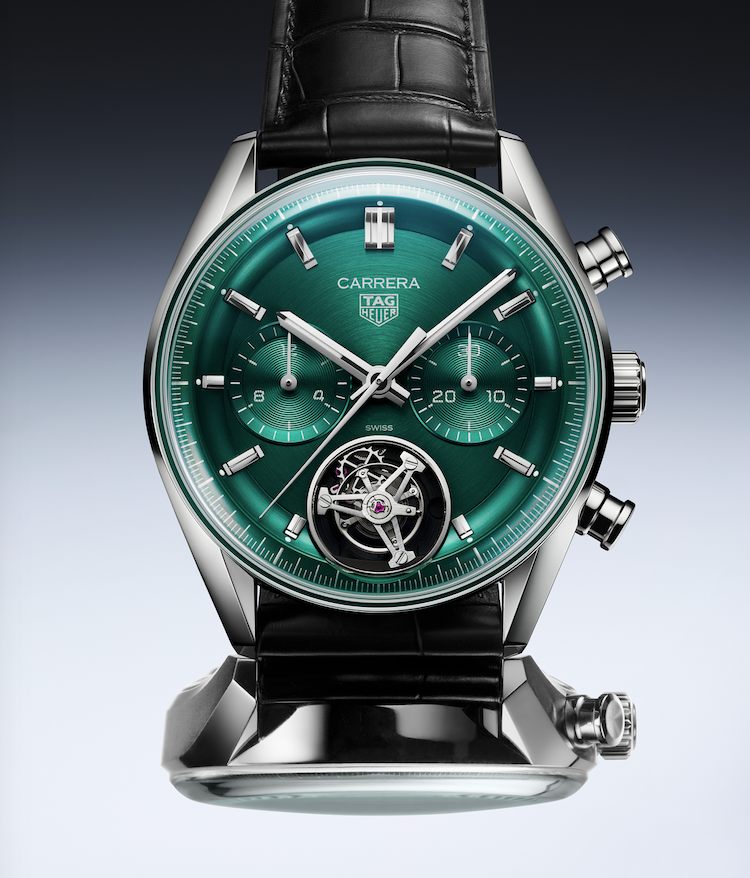 Para completar el lanzamiento, TAG Heuer desvela el TAG Heuer Carrera Cronógrafo Tourbillon -una cautivadora incorporación a la colección Carrera- con una elegante esfera cepillada circular de color verde azulado, que crea una sofisticada pieza única.