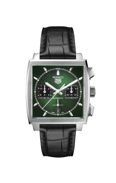 Esta tonalidad de esfera nunca vista en este icónico modelo introduce una nueva perspectiva en el modelo "TAG Heuer Monaco" y resalta las inconfundibles características de diseño del icónico reloj de acero con caja cuadrada. El color degradado de la esfera, del verde claro en el centro al verde oscuro en el borde, transmite una sensación de velocidad. El color verde también recuerda a la famosa parte cubierta de la pista del Gran Premio de Mónaco, que precede al deflector del puerto.