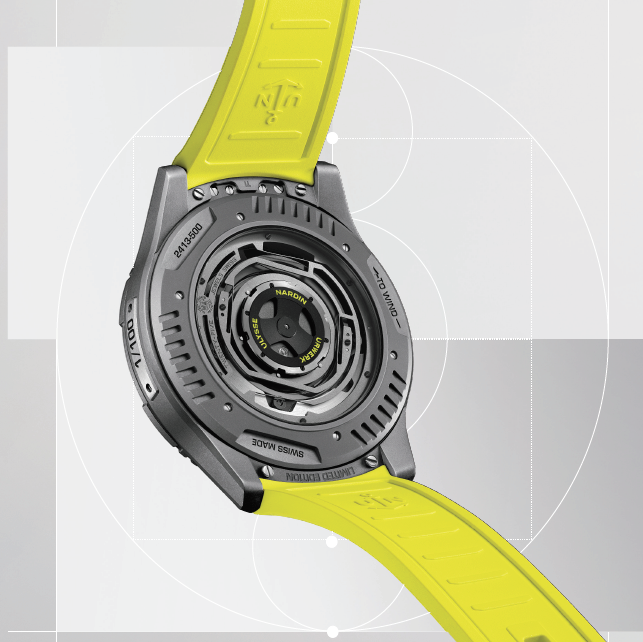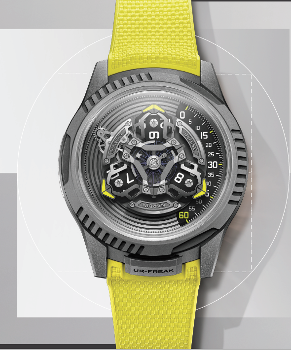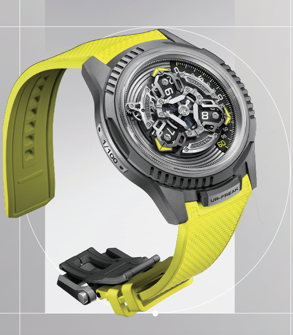 El Freak hace girar todo el movimiento para indicar la hora, mientras que el satélite horario de URWERK desafía la mecánica y transforma la percepción del tiempo. Ahora, dos complejos mecanismos se fusionan en un único calibre propio totalmente integrado. Para crear esta maravilla de la ingeniería, se han desarrollado más de 150 componentes totalmente nuevos, con los que se ha diseñado la distintiva esfera satelital de horas errantes y el bisel de la caja. La hora se indica mediante una de las tres agujas conectadas. La aguja activa se desliza a lo largo de la escala indicadora de minutos situada en el lado derecho de la esfera. Cada aguja tiene un disco abombado giratorio que actúa como indicador de hora saltante. Cuando la hora actual conectada al carrusel giratorio ha completado su recorrido de 60 minutos, el disco de las horas cambia y la siguiente hora está lista para ser leída por la siguiente aguja, que comienza su recorrido desde el inicio de la pista de minutos. Todo el sistema satelital de horas errantes, al más puro estilo Freak, está conectado al sistema de regulación. En el centro se encuentra un oscilador volante con rueda de escape de silicio. Gira con el sistema satelital y da una vuelta completa cada tres horas. Al igual que un tourbillon o carrusel tradicional, el cambio constante de orientación del UR-FREAK ayuda a reducir los errores de sincronización. El UR-FREAK se basa en la caja del reloj Ulysse Nardin Freak [ONE], de 44 mm de diámetro, y está fabricado en titanio pulido con chorro de arena en un característico color gris antracita oscuro de URWERK. A esta base se añaden más elementos de diseño característicos de URWERK que realzan aún más la pieza. Entre ellos, destacan tres secciones acanaladas en el bisel giratorio y en el fondo de la caja de titanio, un elemento característico del diseño de URWERK. Además, el tono del titanio se acentúa con el amarillo eléctrico Pantone 395 C, un color emblemático de URWERK que resalta las agujas satélites, los marcadores de minutos y la correa de caucho a medida. Otra característica distintiva de la mayoría de los relojes Freak de Ulysse Nardin es la ausencia de corona tradicional. Por consiguiente, el UR-110 tampoco la tiene, lo que contribuye a una estética limpia y aerodinámica en la muñeca. En lugar de una corona, los relojes de esta colección suelen tener un bisel giratorio y un fondo de caja. Una pequeña lengüeta, conocida como «locker», situada en la posición de las seis horas, mantiene el bisel seguro cuando no se utiliza. Este reloj de edición limitada tiene una etiqueta especial «URFREAK ». Al levantar el «locker», el bisel gira libremente y, con él, las agujas se mueven para ajustar la hora. Aunque el UR-FREAK emplea un sistema de cuerda automática basado en Grinder®, el movimiento UN-241 también se puede dar cuerda manualmente girando el fondo de la caja. A pesar de estar encajada entre piezas deslizantes, la caja del UR-FREAK ofrece una hermeticidad de 30 metros.