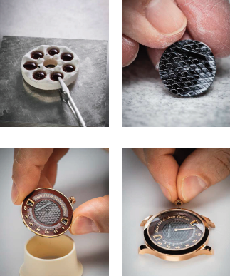 Para adornar el reloj Midnight Heure d’ici & Heure d’ailleurs con un toque singular, Van Cleef & Arpels recurrió a los artesanos de su taller de esmaltes de Ginebra. Los expertos comenzaron analizando las propiedades ópticas de determinadas piedras preciosas, como los rubíes, que presentan matices fríos a pesar de su color cálido. Tras una larga serie de pruebas, lograron reproducir este efecto dicroico en un esmalte teñido de un denso y profundo tono ámbar-marrón. Sus matices cambian con la luz reflejada por un fondo de oro pulido a espejo que realza los reflejos dentro de la esfera. El primer gran reto vino acompañado de la delicada tarea de imprimir un motivo piqué en el esmalte —una alusión al sello distintivo de la Maison—, así como de un diseño guilloché que se extiende radialmente hasta el borde. Para lograr una interacción armoniosa entre ambas decoraciones, se necesitaba un esmalte que presentara dos intensidades de color distintas, ya que el espesor de la capa afecta tanto al tono como a la chatoyance, es decir, al comportamiento de la luz dentro del material. Para crear los motivos en relieve, los esmaltadores de Van Cleef & Arpels se inspiraron en las técnicas de soplado de vidrio, que adaptaron a las herramientas de relojería. El esmalte se trabajó primero a baja temperatura (por debajo de 500 °C) durante más de 30 horas para garantizar una distribución uniforme del color. Dos cocciones posteriores a altas y muy altas temperaturas (por encima de los 1.000 °C) sirvieron para eliminar las burbujas y preparar el material para el modelado, que se realizó con un troquel aplicado a mano sobre el esmalte. Tras un último paso por el horno, comenzó la etapa final de modelado.