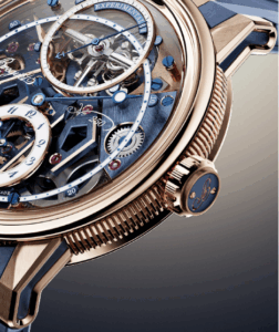 Desde principios de la década de 2010, la manufactura no ha dejado de perfeccionar su dominio del campo magnético. Hoy en día se ha extendido al escape, pero su principio fundamental sigue siendo el mismo: crear un campo y unas interacciones magnéticas controladas. Se trata de dos ruedas de escape, cada una de ellas dotada de una pista magnética, en cuyo centro late un áncora con paletas también magnéticas. La idea se inspira en los escapes de fuerza constante. Por debajo de un determinado par de funcionamiento, el tourbillon se detiene muy rápidamente. Por encima de este umbral, el volante oscila a su máxima amplitud. Este nuevo escape también permite desacoplar los impulsos transmitidos al volante, la rotación de la rueda de escape y, por lo tanto, del resto del engranaje. A diferencia de un movimiento de áncora suizo, la inercia de la jaula del tourbillon casi no tiene influencia alguna. Al desacoplar estas dos funciones, Breguet ha logrado crear un tourbillon con un oscilador de 10 Hz en unas dimensiones tales que también dan rienda suelta a las opciones de diseño, por ejemplo, colocando el volante desplazado del centro de rotación de la jaula. Gracias a la alta frecuencia, la rotación de todo el tourbillon es tan suave que sus pasos son imperceptibles para el ojo.