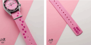 Equipada con una correa de nailon intercambiable decorada con las huellas de la Pantera Rosa, esta edición limitada incorpora la emblemática frase “WET PAINT”, igual que en la animación original. La misma tipografía se utiliza en los números del bisel, capturando hasta el último matiz del estilo del cortometraje. En el fondo de la caja aparece una de sus escenas más recordadas, con la Pantera Rosa camuflándose contra una pared rosa, mientras que el borde está grabado con las palabras “Limited Edition” y el número de serie individual que certifica su exclusividad. La pieza se presenta en un estuche especial inspirado en la casa del Hombrecito siendo pintada de rosa, un guiño perfecto a la eterna batalla entre ambos personajes.